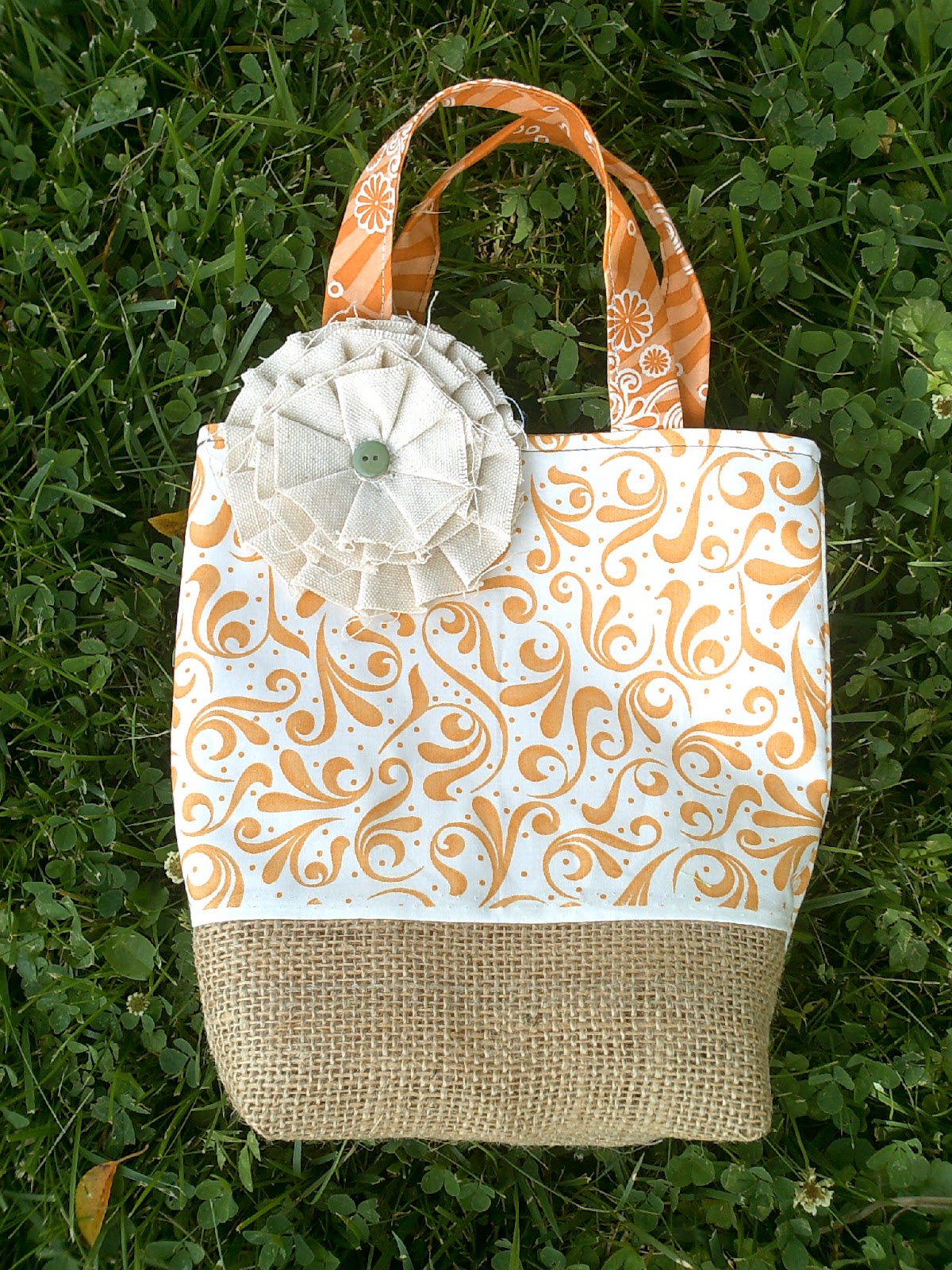 The 11-inch straps and lining are my hoarded tangerine Happy Mochi. The canvas flower is from AC Moore as is the burlap flower: